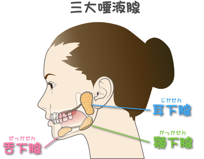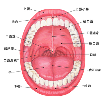その内訳は、歯、歯肉、舌、口蓋(こうがい:上アゴ)、頬粘膜(きょうねんまく:ほっぺの内側)、口腔底(こうくうてい:ベロの下)、唾液腺(だえきせん:よだれの出る腺)で構成されており、摂食・嚥下(せっしょく・えんげ)、消化、呼吸、発音、会話において、非常に重要な働きをしています。