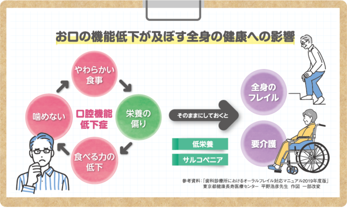 口腔機能低下が徐々に進み、放置すると、食べて飲み込む機能が低下してしまい、低栄養、サルコペニア(身体機能の低下)、誤嚥性肺炎、認知症、糖尿病、脳血管疾患・パーキンソン病、心疾患(狭心症・心筋梗塞)などの全身疾患へつながるリスクがあると言われています。